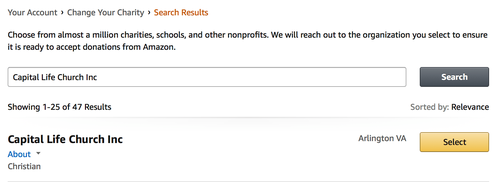 - Choose "Capital Life Church Inc Arlington VA" to receive donations from eligible purchases